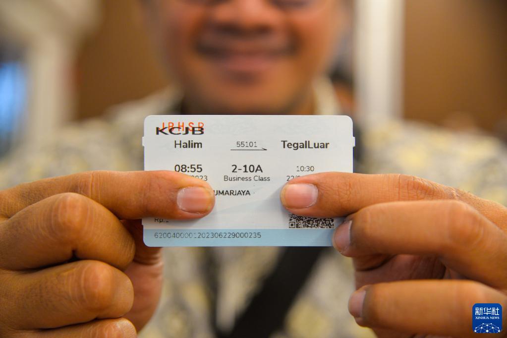 6月22日,在印度尼西亞雅萬高鐵正在進行聯調聯試的綜合檢測列車上,一名記者展示紀念樣票。