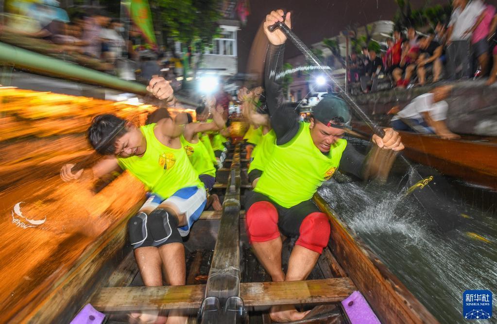佛山疊滘東勝村的“扒仔”(槳手)在端午前堅持每天夜晚訓練,以求能在端午龍船漂移賽中展示最佳狀態(6月16日攝)。