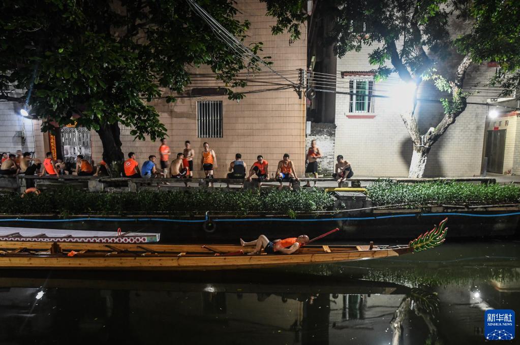深夜,經過一晚高強度訓練之后,佛山疊滘東勝村的“扒仔”(槳手)躺在龍船上休息(6月16日攝)。