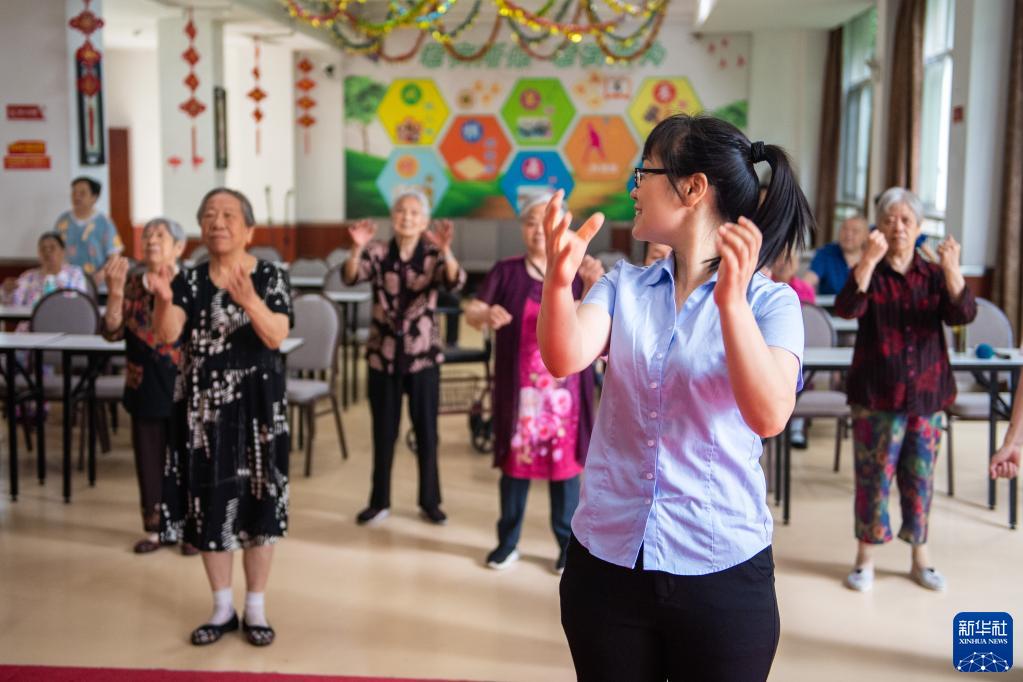 6月20日,工作人員(前)帶領老年人在漢壽縣社會福利中心跳舞。