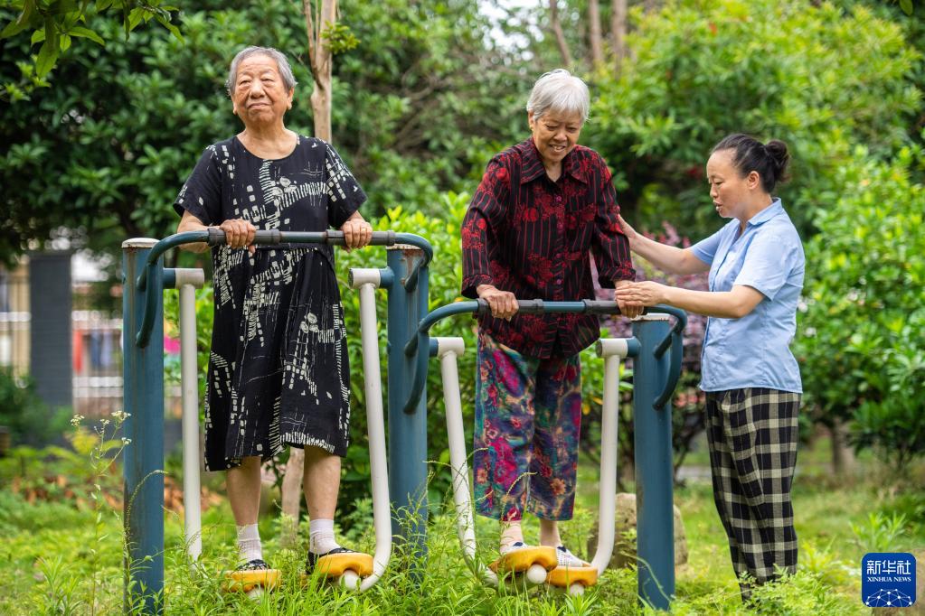 6月20日,工作人員(右一)輔助老年人在漢壽縣社會福利中心健身。
