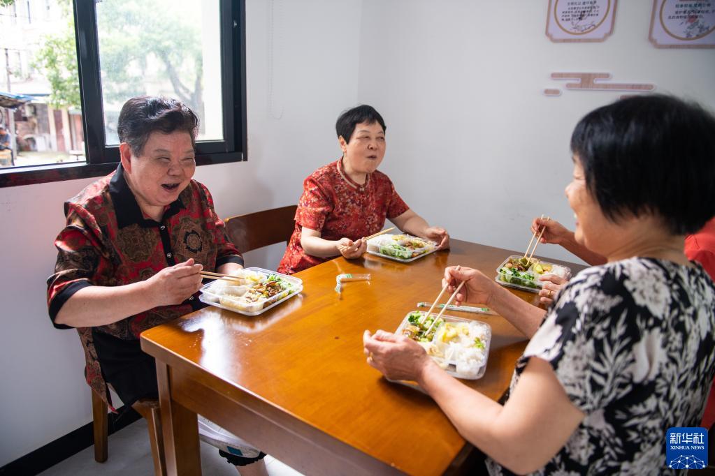 6月20日,老人們在漢壽縣龍陽街道城東社區日間照料中心吃午餐。