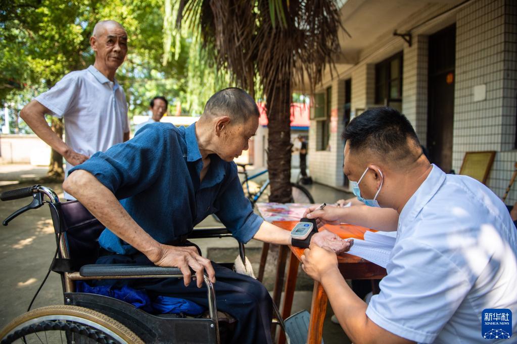 6月21日,醫護人員(右一)在安鄉縣深柳鎮官陵湖敬老院為老年人體檢。