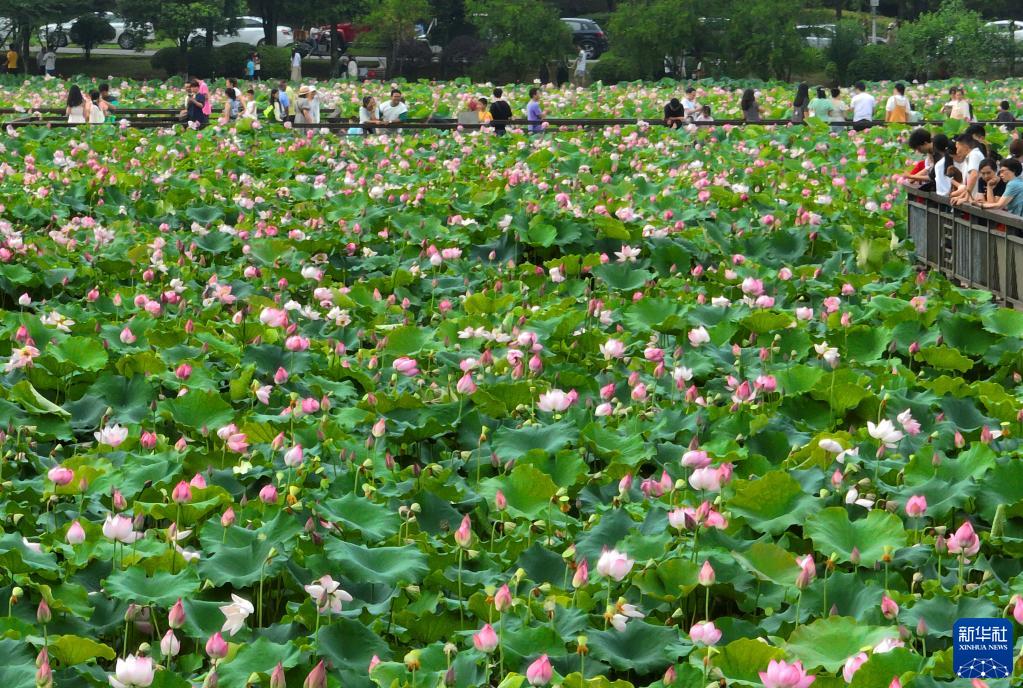 6月22日,人們在湖南省衡陽市南湖公園賞荷花(無人機照片)。
