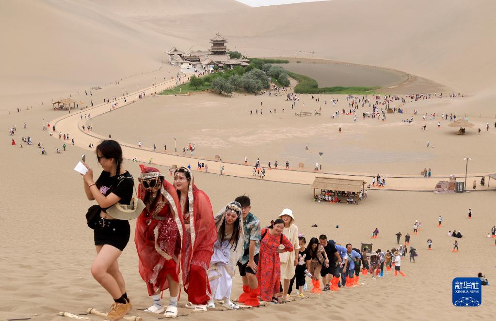 6月23日,游客在甘肅省敦煌市鳴沙山月牙泉景區游覽。