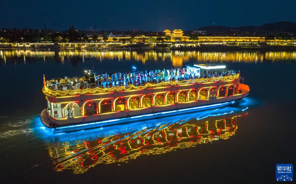 6月22日晚,游人乘坐漢江游輪欣賞湖北襄陽古城夜景(無人機照片)。