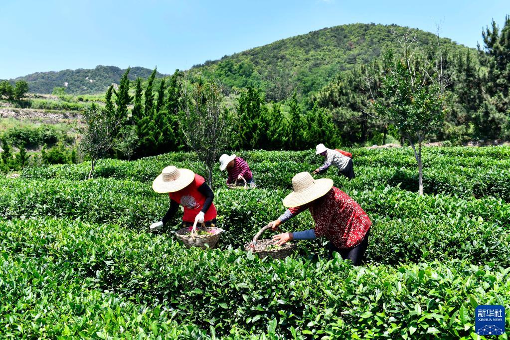 6月23日,在乳山市極北茶葉種植合作社大孤山鎮基地,茶農在采摘鮮茶。該合作社帶動周邊200多位村民就業增收。