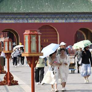 6月23日,在北京天壇公園,出行的游客撐傘抵擋強烈的陽光。
