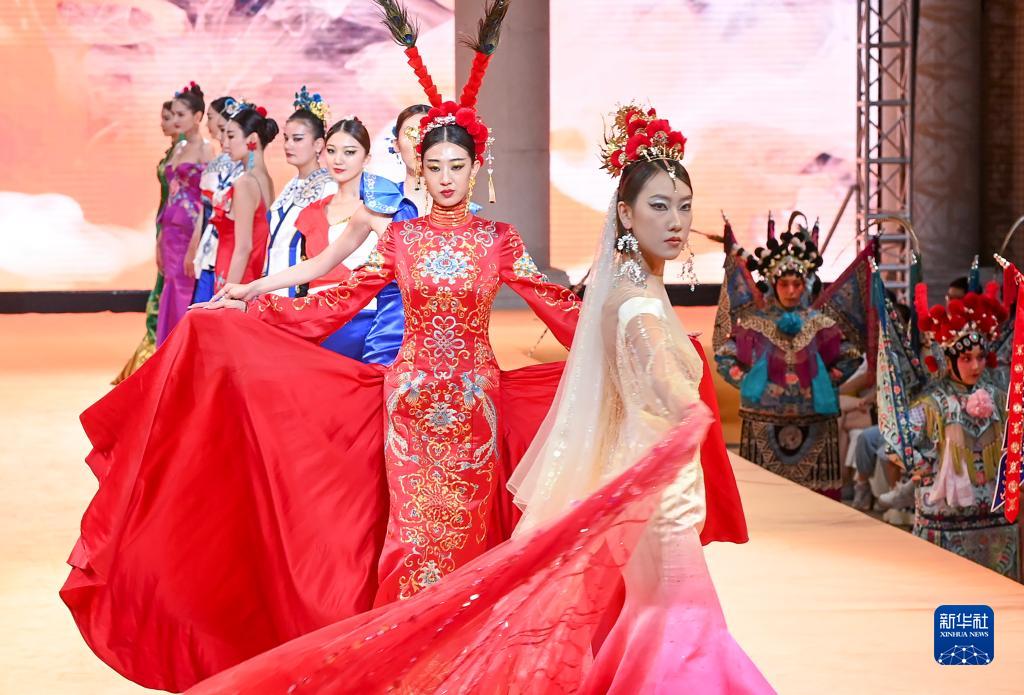 6月22日晚,在新疆國際大巴扎景區,模特在京劇《定軍山》演出同時展示時裝。