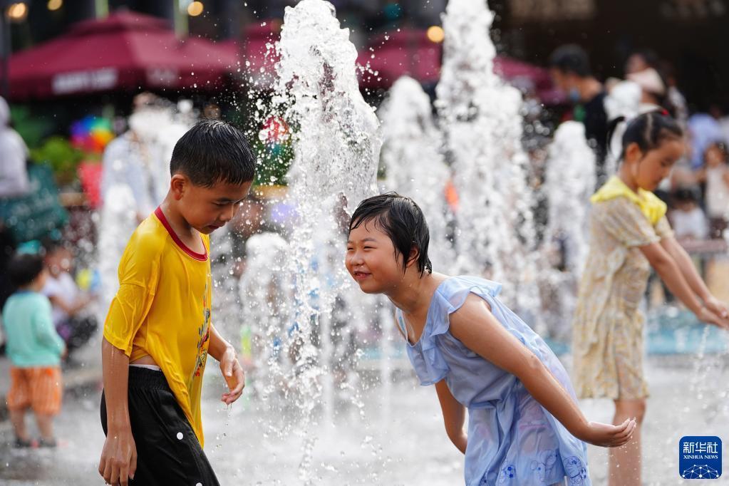 6月23日,小朋友在北京五棵松華熙Live一處噴泉戲水。