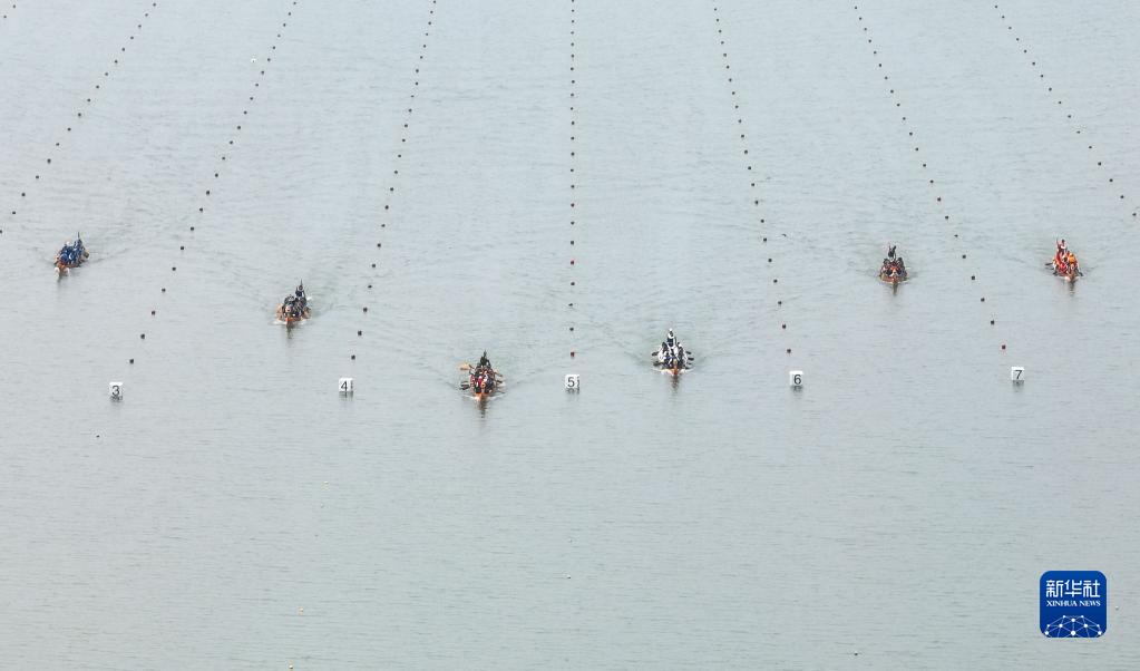 6月23日,在江蘇省泰州市水上運動訓練基地,人們參加龍舟比賽(無人機照片)。
