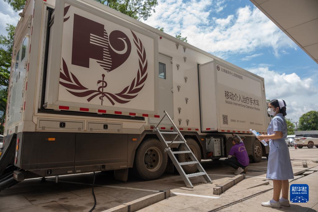 這是6月20日在老撾首都萬象瑪霍索醫院外拍攝的移動介入治療手術車。