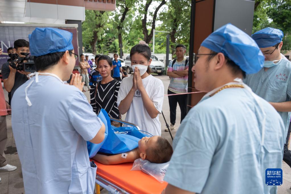 6月20日,在老撾首都萬象瑪霍索醫院,患病兒童在移動介入治療手術車完成治療后,中國醫生叮囑孩子家人。