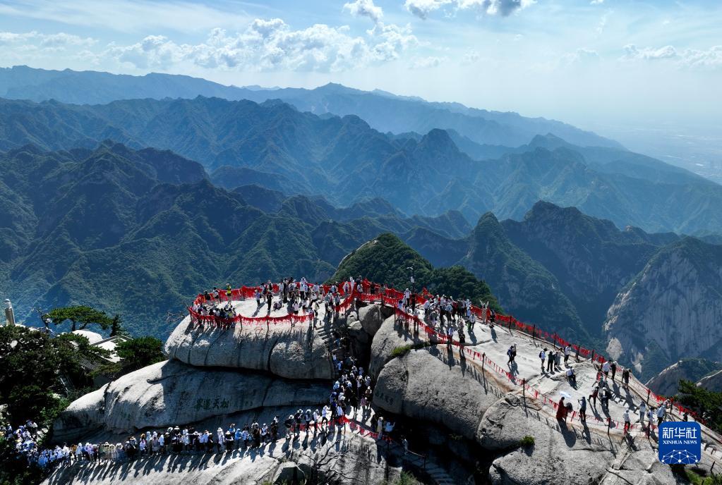 6月23日是端午小長假的第二天,在西岳華山,游客在工作人員的引導下有序登山,領略“奇險天下第一山”風光。