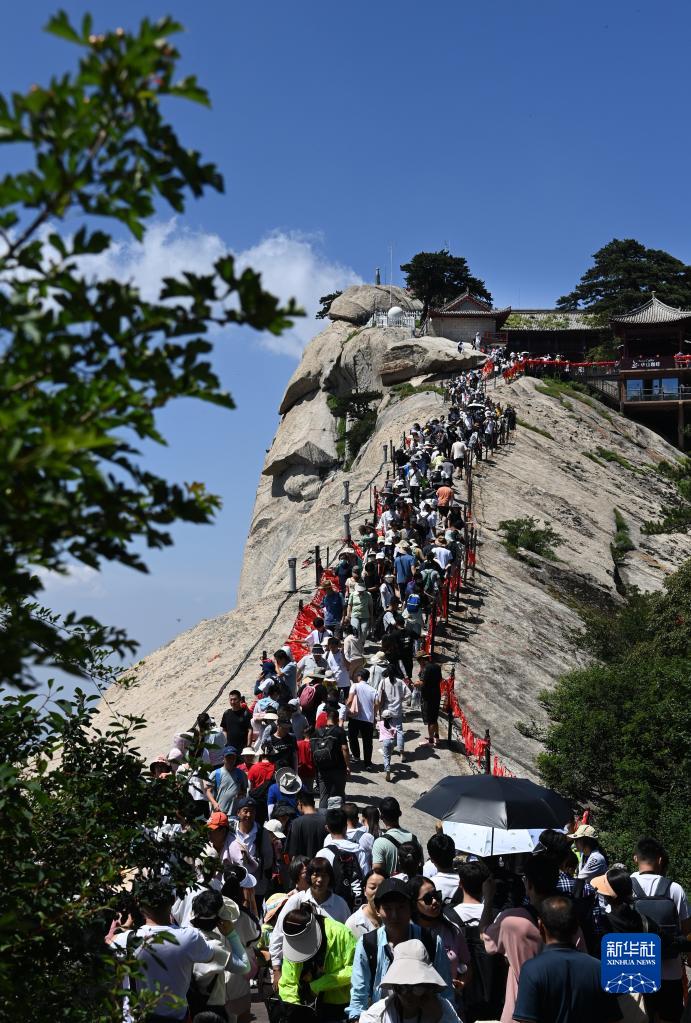 6月23日是端午小長假的第二天,在西岳華山,游客在工作人員的引導下有序登山,領略“奇險天下第一山”風光。