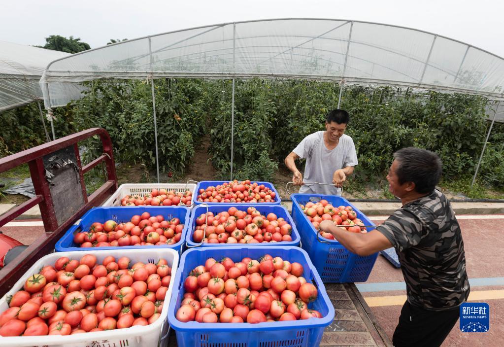 在東風堰灌溉區域之一的夾江縣甘江鎮金銀河村,村民將采摘的西紅柿裝車(6月23日攝)。