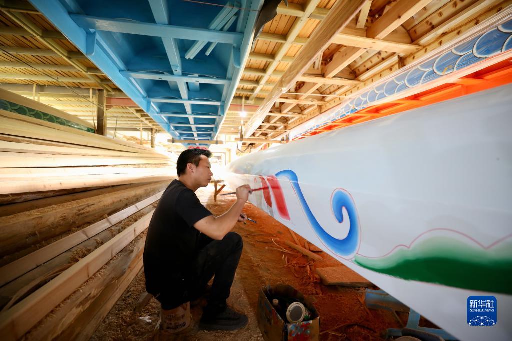 匠人在福州市閩侯縣方莊村對龍舟進行彩繪(2023年5月23日攝)。