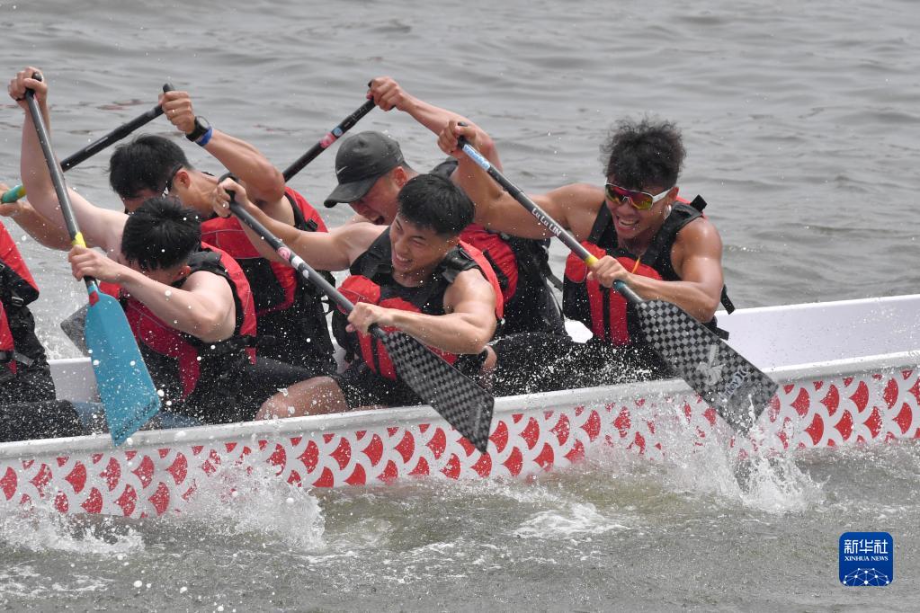 林益宏(右一)在廈門集美舉行的海峽兩岸龍舟賽上奮力劃槳(2023年6月3日攝)。