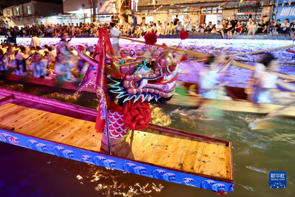 人們在福州市長樂區三溪村穿村而過的小溪中劃龍舟(2023年6月20日攝)。
