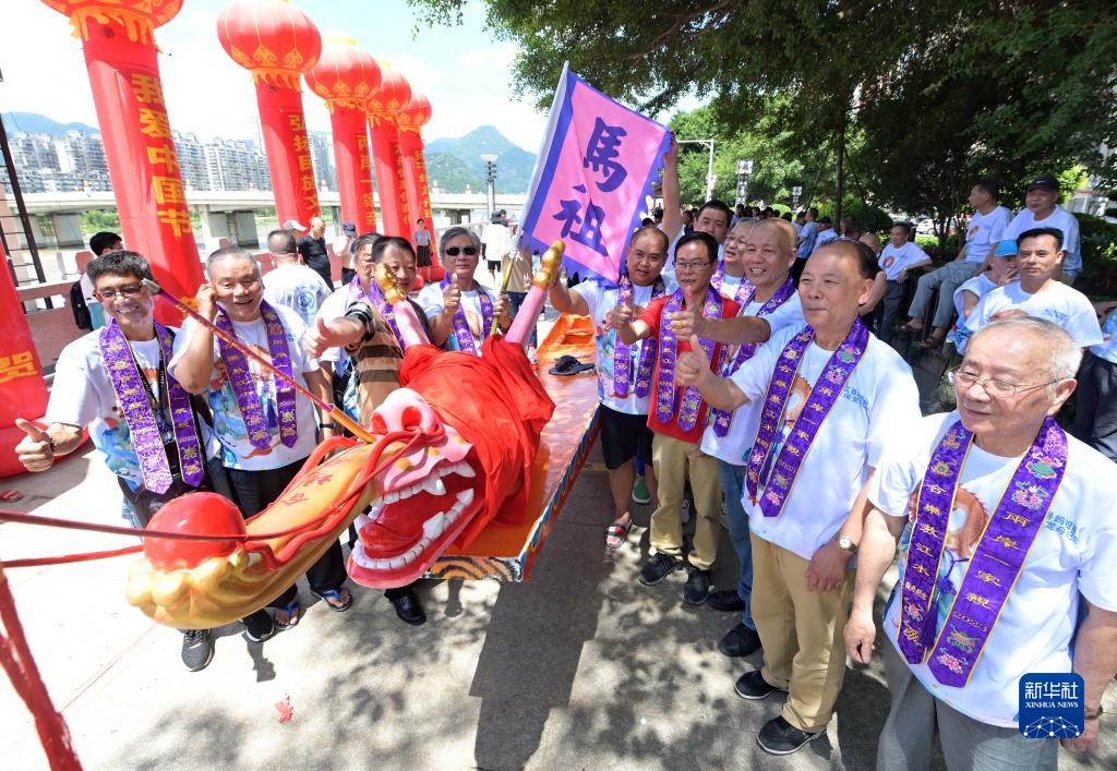 連江縣兩岸龍舟文化交流協會代表在福州市連江天后宮向馬祖鄉親贈送新龍舟(2023年5月31日攝)。