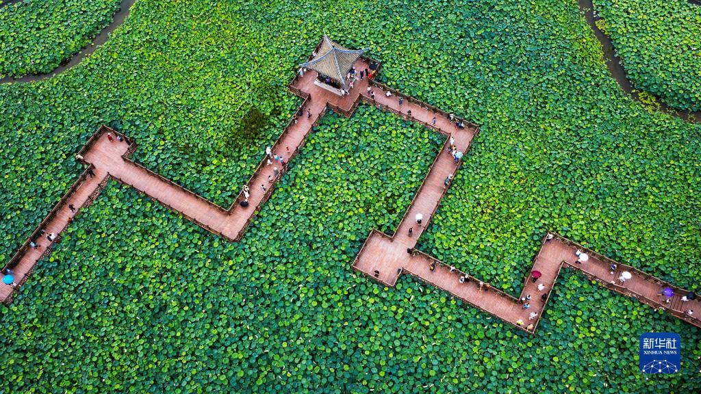 6月24日,游人在廣西南寧市南湖公園觀賞荷花(無人機照片)。