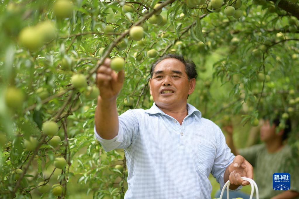 6月24日,夏國剛在貴州省開陽縣龍水鄉龍溪村烏江河畔的果園采摘蜂糖李。