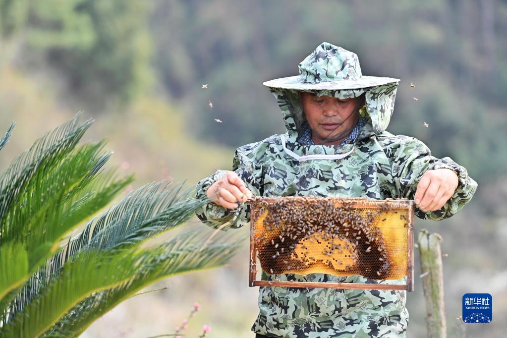 夏國剛在貴州省開陽縣龍水鄉龍溪村烏江河畔的果園查看蜜蜂產蜜情況(3月10日攝)。