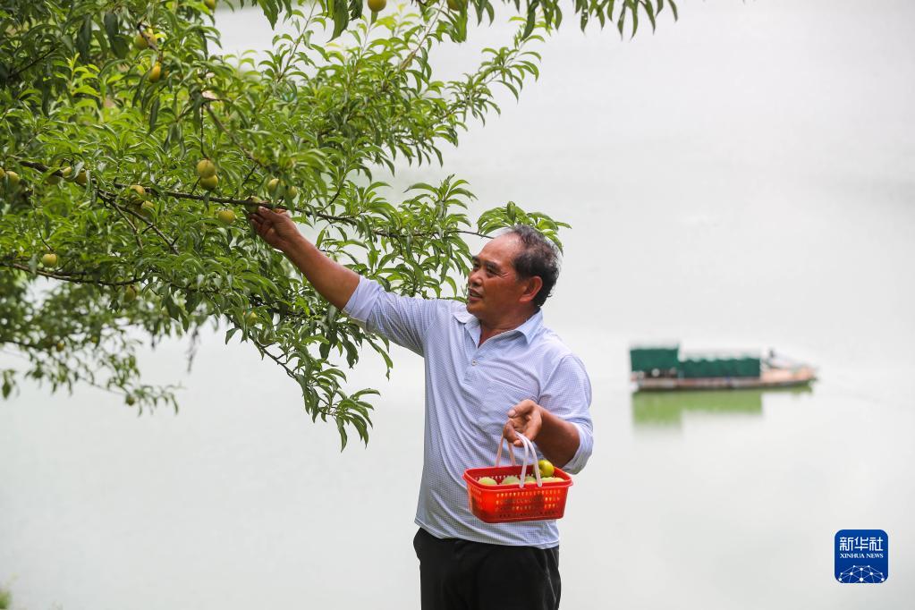 6月24日,夏國剛在貴州省開陽縣龍水鄉龍溪村烏江河畔的果園里采摘蜂糖李。