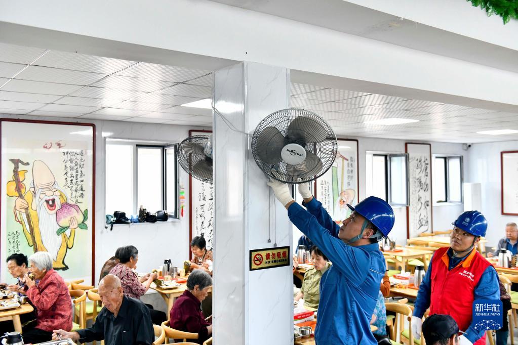 6月24日,在乳山市城區街道騰甲莊村幸福食堂,國網乳山市供電公司的夏季應急服務隊隊員在檢修電風扇。