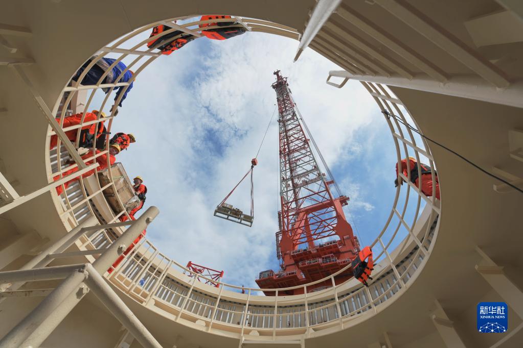 6月24日,施工人員在16兆瓦大容量海上風電機組導管架上作業。