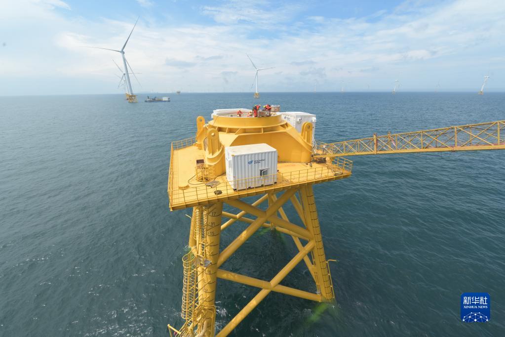 6月24日拍攝的16兆瓦大容量海上風電機組導管架基礎。