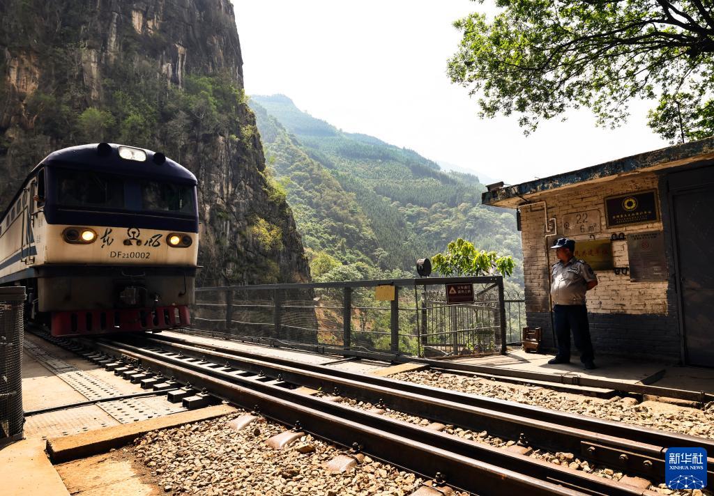 6月2日,火車駛過“人字橋”時,楊有光在軌道旁跨立觀察。