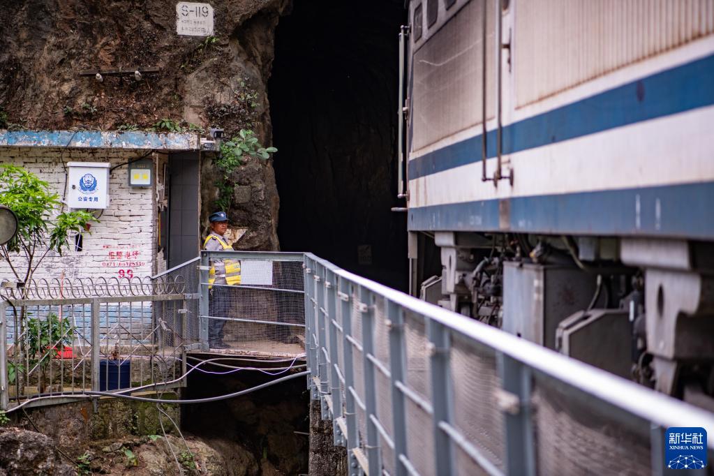 穿上工作服,拿著手電筒,穿行在隧道和橋梁間,這是楊有光再熟悉不過的工作內容?;疖囻偨洝叭俗謽颉鼻昂?,須從兩個隧道穿過。為保障行車安全,楊有光不僅要檢查橋面狀況,還需要精準把握隧道內的情況。他要穿行在隧道內外,巡查大橋整體狀況,沿著陡峭的階梯走到橋下,察看零部件狀況?;疖囻倎頃r,楊有光站在自己約3平米的值班室門口跨立候車,目視火車駛過“人字橋”,并將通過時間記錄下來。
