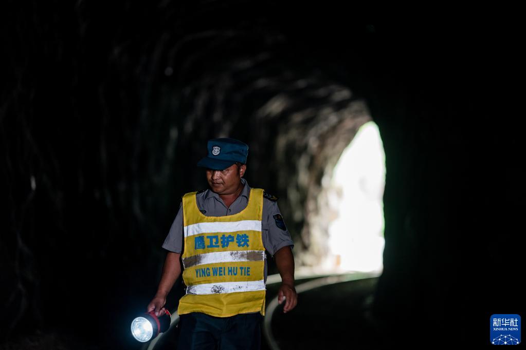 穿上工作服,拿著手電筒,穿行在隧道和橋梁間,這是楊有光再熟悉不過的工作內容?;疖囻偨洝叭俗謽颉鼻昂?,須從兩個隧道穿過。為保障行車安全,楊有光不僅要檢查橋面狀況,還需要精準把握隧道內的情況。他要穿行在隧道內外,巡查大橋整體狀況,沿著陡峭的階梯走到橋下,察看零部件狀況?;疖囻倎頃r,楊有光站在自己約3平米的值班室門口跨立候車,目視火車駛過“人字橋”,并將通過時間記錄下來。
