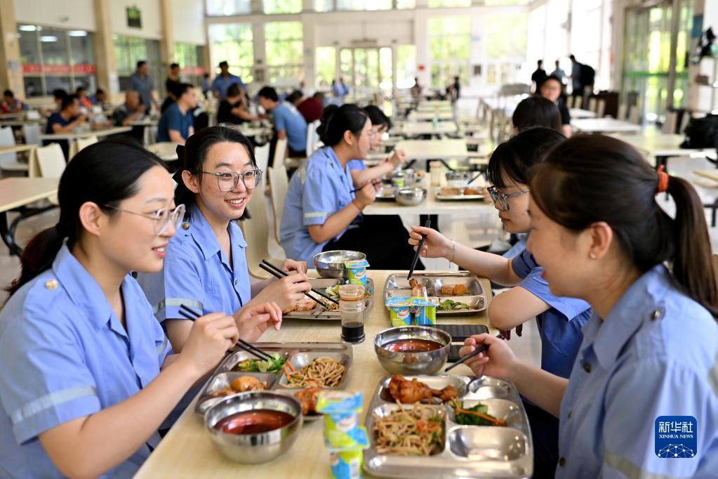 天車司機王孟媛(左二)和同事們在食堂吃午飯(6月20日攝)。