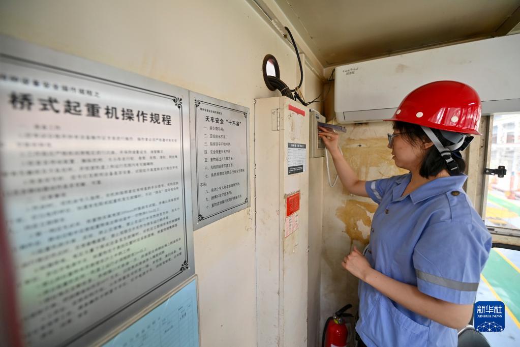 在中國鐵路太原局集團有限公司太原機務段太北檢修車間,天車司機王孟媛在作業前確認各項設備運轉正常(6月20日攝)。