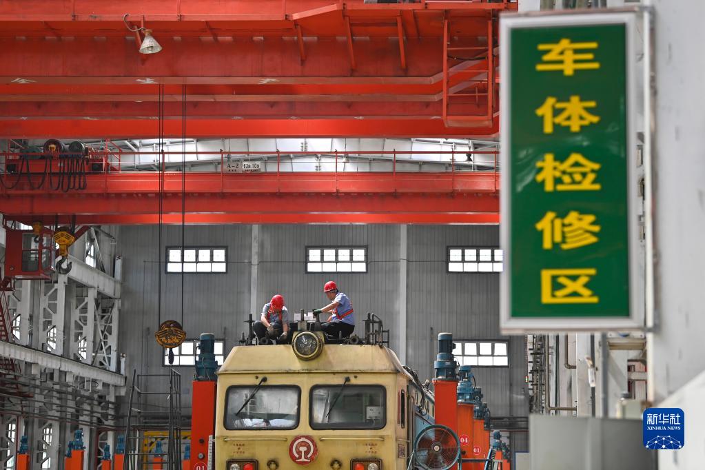 在中國鐵路太原局集團有限公司太原機務段太北檢修車間,工作人員對貨運機車進行檢修(6月20日攝)。