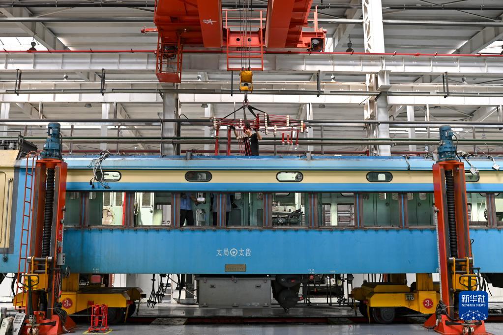 在中國鐵路太原局集團有限公司太原機務段太北檢修車間,工作人員在天車的配合下對貨運機車進行檢修(6月20日攝)。
