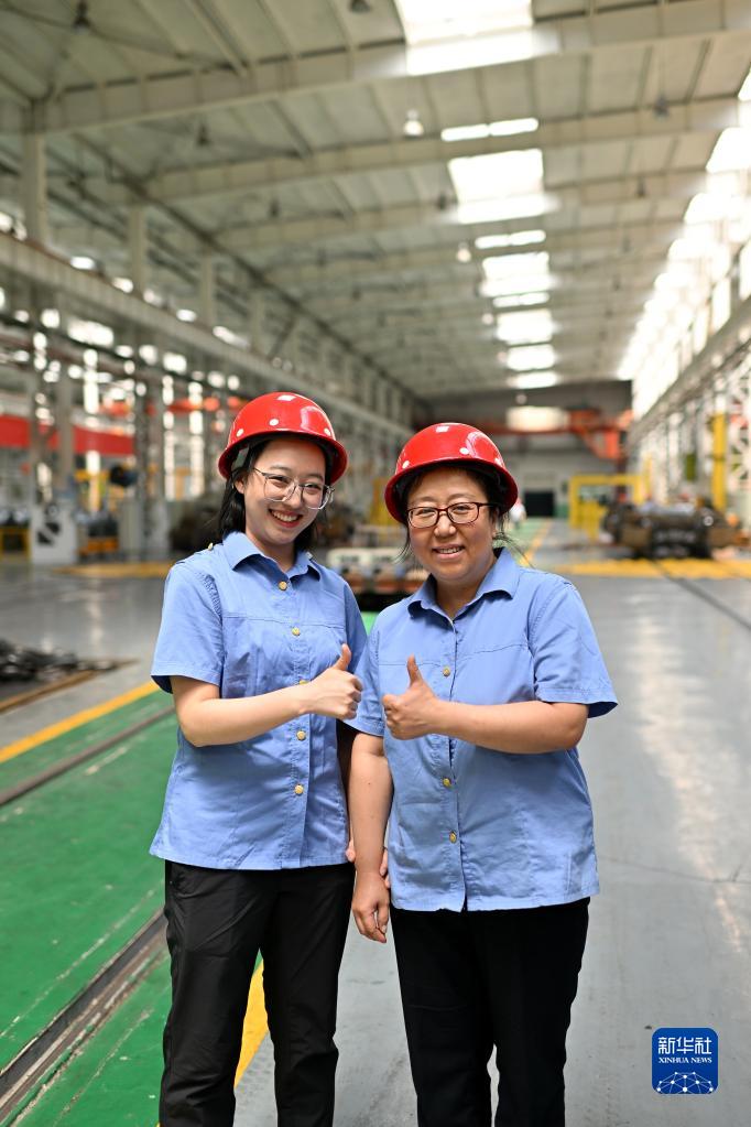 動力組天車司機王孟媛(左)和班組“大姐”陳援紅在車間合影(6月15日攝)。