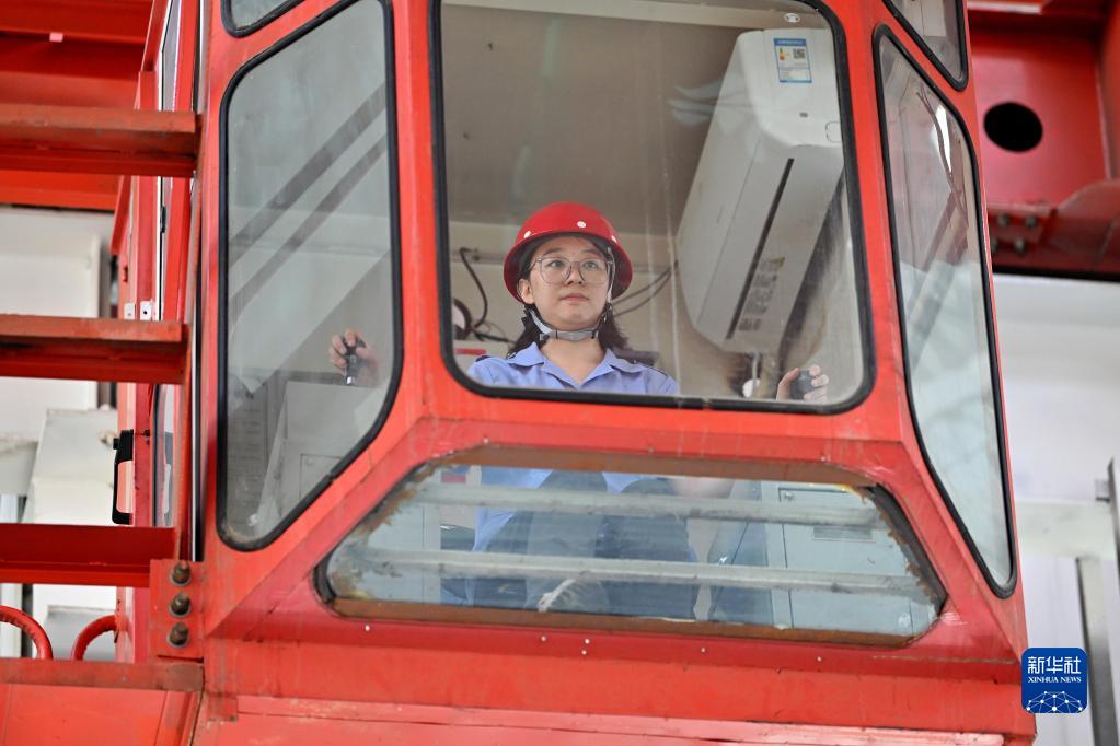 在中國鐵路太原局集團有限公司太原機務段太北檢修車間,天車司機王孟媛在天車上作業(6月20日攝)。