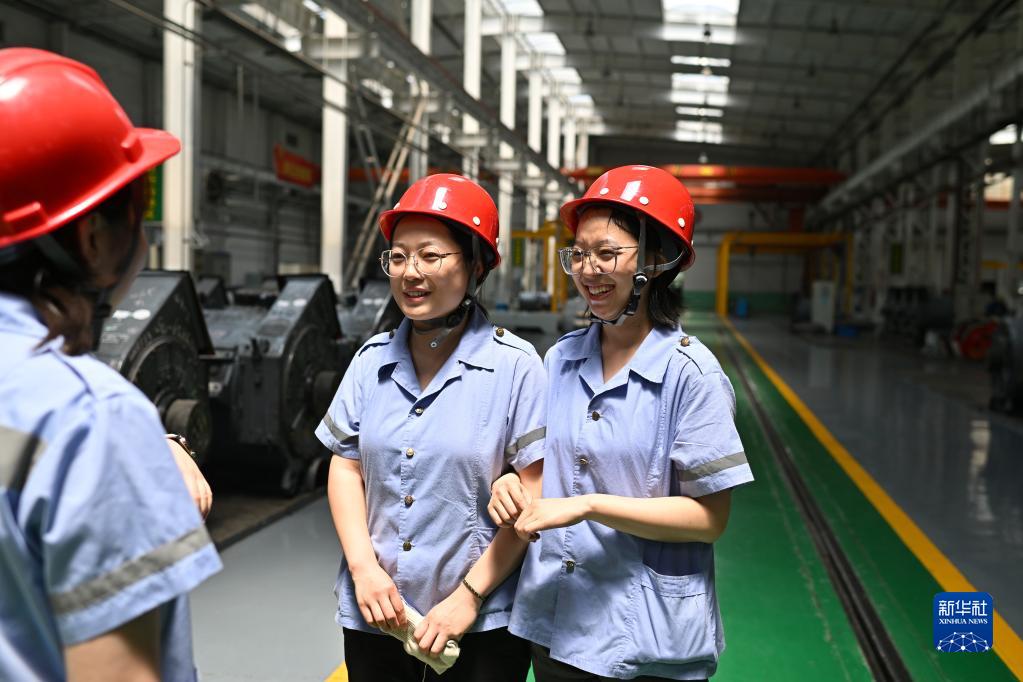 上午工作結束后,動力組天車司機王孟媛(右)和同事們聊天(6月20日攝)。