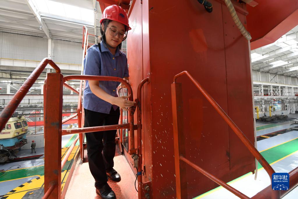在中國鐵路太原局集團有限公司太原機務段太北檢修車間,天車司機王孟媛在工作結束后走下天車(6月15日攝)。