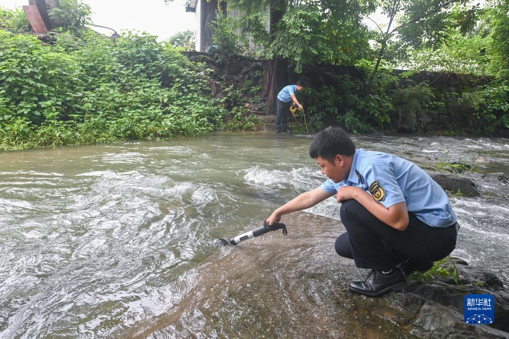 6月25日,杭州市生態環境局臨安分局的工作人員在位于臨安區的杭州亞運會場館周邊的溪水里取樣。