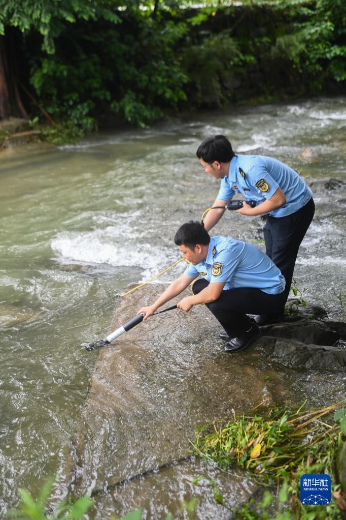 6月25日,杭州市生態環境局臨安分局的工作人員在位于臨安區的杭州亞運會場館周邊進行溪水取樣。