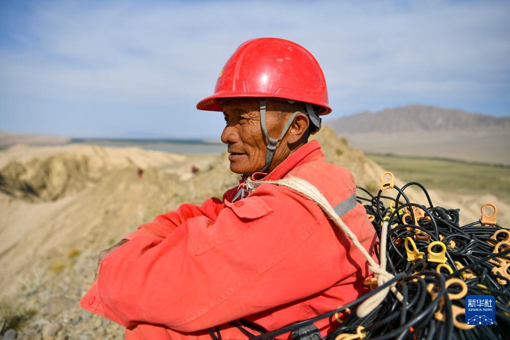 東方物探公司塔里木物探處2170隊放線班組53歲的工人善從余在運送檢波器途中(6月20日攝)。