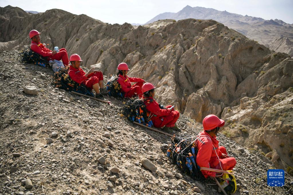 東方物探公司塔里木物探處2170隊放線班組的工人在運送檢波器途中休息(6月20日攝)。