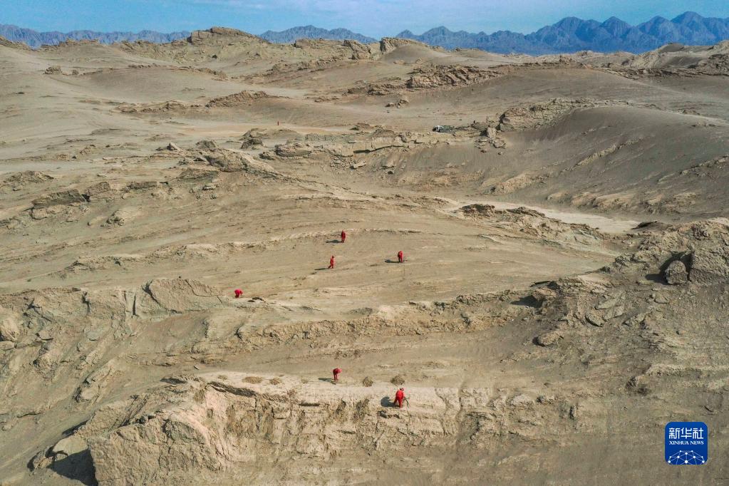 東方物探公司塔里木物探處2170隊放線班組的工人在山區放線施工(6月19日攝,無人機照片)。