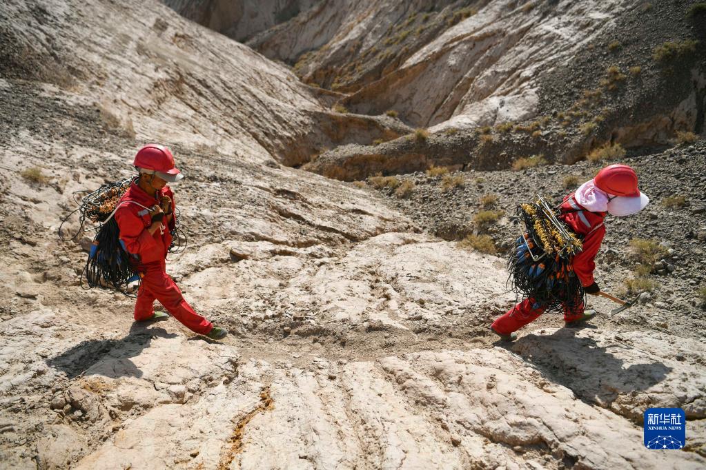 東方物探公司塔里木物探處2170隊放線班組的工人背著檢波器行走在陡坡上(6月20日攝)。