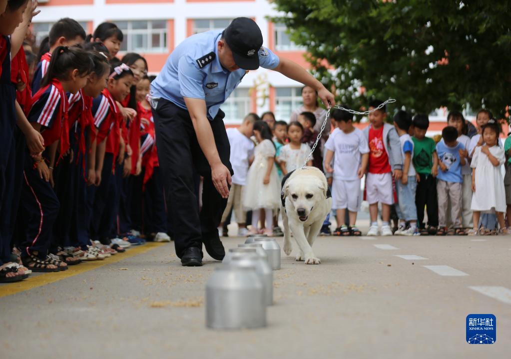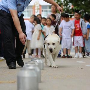 6月25日,山東省沂南縣公安局在辛集鎮中心小學開展禁毒主題宣傳活動,給小朋友演示緝毒犬嗅毒。