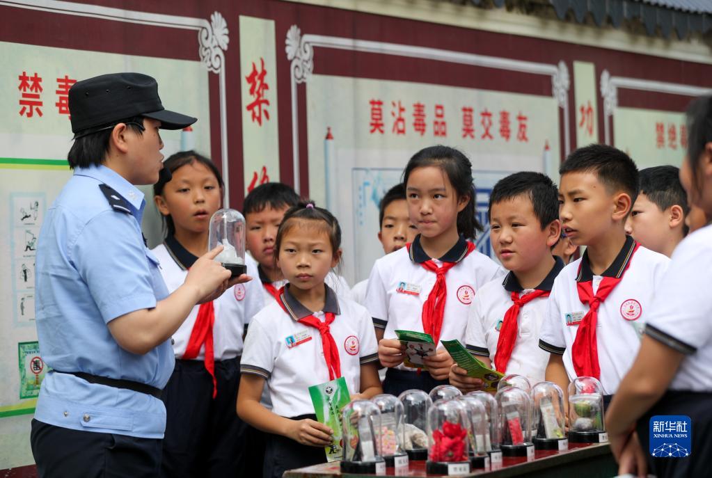 6月25日,民警在貴州省開陽縣第二小學禁毒園地為學生講解禁毒知識。